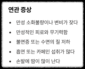 | 5 | 만성 소화불량이나 변비 등 소화기 문제가 잦다. | |