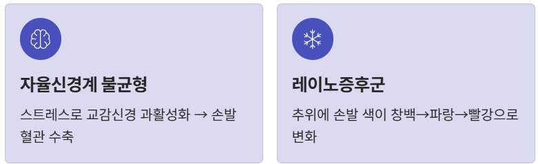 - 자율신경계 불균형: 스트레스, 수면 부족 등으로 교감신경이 과활성화되면, 생존을 위해 몸의 중심부에 혈액을 집중시키고 손발의 혈관을 과도하게 수축시켜 만성적인 수족냉증을 유발합니다.