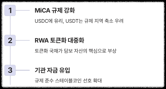 앞으로 **스테이블코인 대장주** 경쟁은 규제와 실물자산(RWA) 토큰화 시장에서 결정될 가능성이 높습니다. 특히 유럽의 **EU MiCA (Markets in Crypto-Assets)** 규제는 스테이블코인의 발행 요건을 매우 엄격하게 만들었죠. 이 기준을 충족시키는 USDC와 같은 코인이 유럽 시장에서 우위를 점할 것입니다.
