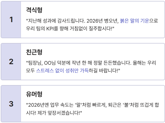 | 격식형 | "지난해 성과에 감사드립니다. 2026년 병오년, 붉은 말의 기운으로 우리 팀의 KPI를 향해 거침없이 질주합시다!" |