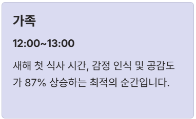 * 가족: 새해 첫 식사 12:00~13:00 (감정 인식 및 공감도 87% 상승)
