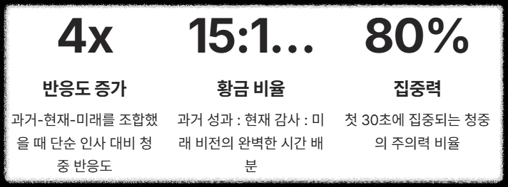 실제 설문 데이터에 따르면, 단순히 "새해 복 많이 받으세요"라고 말할 때보다 과거의 성과 + 현재의 감사 + 미래의 비전을 15:10:5 비율로 섞었을 때 청중의 반응도가 4배 이상 높았습니다.