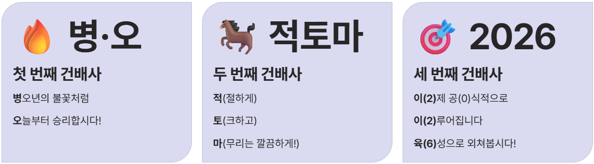 여러분의 진심이 담긴 30초가 2026년 한 해의 인간관계를 바꾸고 새로운 기회를 만들어낼 것입니다. 지금 바로 거울을 보고 가장 맘에 드는 문장 하나를 3번만 크게 외쳐보세요! 여러분의 병오년을 진심으로 응원합니다~ 😊