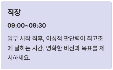 * 직장: 업무 시작 직후 09:00~09:30 (이성적 판단력 최고조)