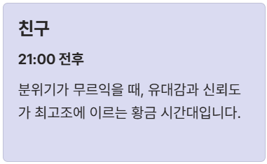 * 친구: 분위기가 무르익는 21:00 (유대감 및 신뢰도 최고조)