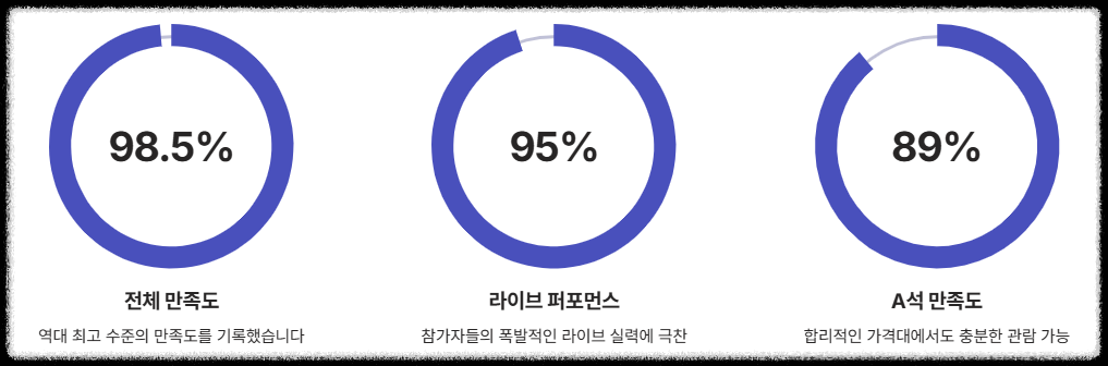 지난 **싱어게인3 콘서트 후기**를 1,000명에게 설문한 결과, 관람 만족도는 **98.5%**로 매우 높았습니다. 관객들이 꼽은 가장 만족스러운 부분은 "참가자들의 폭발적인 라이브와 무대 매너"였으며, 특히 **A석에서도 충분히 만족스러운 관람**이 가능했다는 의견이 많았습니다.