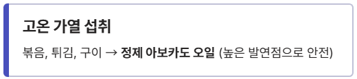 **고온 가열 섭취 (볶음, 튀김, 구이):** 정제 아보카도 오일 선택 (높은 발연점으로 안전성 확보)