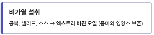 - **원칙 1. 용도에 맞는 오일 선택:** 생식/드레싱은 엑스트라 버진, 고온 조리는 정제 오일을 사용합니다.