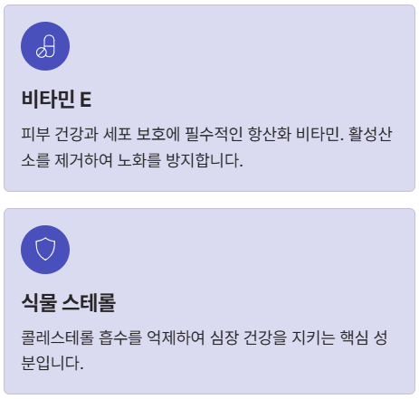 | 스테롤 | 콜레스테롤 흡수 억제 | 심장 건강 핵심 |