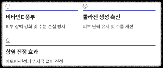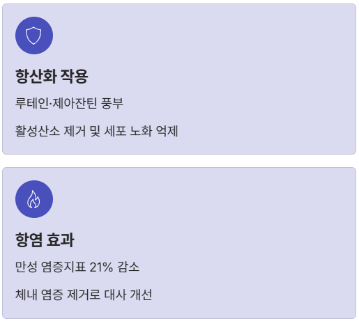 - 핵심 2 (피부): **비타민E**와 카로티노이드가 강력한 **항산화** 작용을 해 **피부보습** 및 탄력 개선에 효과적입니다.