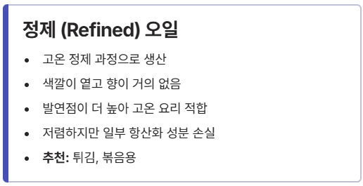 - 📌 정제 (Refined) 오일: 고온에서 정제 과정을 거쳐 생산됩니다. 색깔이 옅고 향이 거의 없어 요리에 두루 사용하기 좋고, 발연점이 더 높아집니다. **저렴하지만 일부 항산화 성분은 파괴될 수 있습니다.**