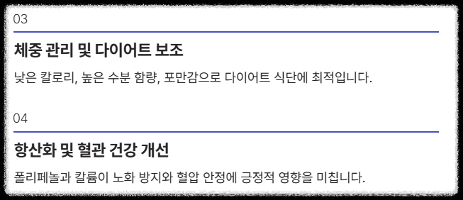| ③ 체중 관리 및 다이어트 보조 | 낮은 칼로리와 높은 수분 함량(80% 이상), 그리고 포만감을 주는 식이섬유 덕분에 다이어트 식단에 최적입니다. 달콤하지만 죄책감을 덜 수 있는 자연의 단맛을 제공하는 것도 큰 장점이죠. |