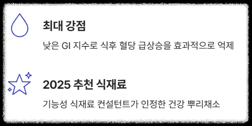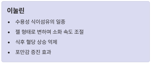 - 이눌린: 프락토올리고당의 일종으로, 수용성 식이섬유의 한 형태입니다. 소화 과정에서 수분을 흡수하여 젤 형태로 변하며 음식물의 소화 속도를 늦춥니다. 이는 당연히 **식후 혈당 상승을 억제**하는 데 결정적인 역할을 해요.