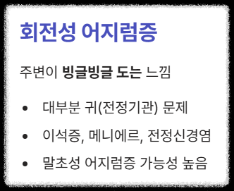 - 회전성: 대부분 귀(전정기관)의 문제인 말초성 어지럼증일 확률이 높습니다. (이석증, 메니에르, 전정신경염 등)