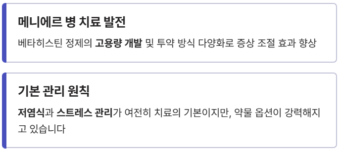 메니에르 병은 여전히 치료가 까다롭지만, 2025년에는 베타히스틴 정제의 고용량 개발 및 투약 방식이 다양화되어 증상 조절에 훨씬 효과적인 결과를 보이고 있어요. 저염식과 스트레스 관리가 여전히 기본이지만, 약물 치료 옵션이 더 강력해지고 있다는 점은 희소식입니다!