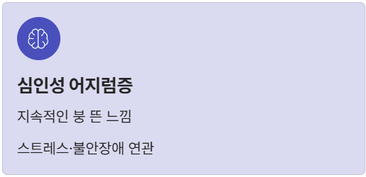 | 심인성 어지럼증 | 지속적인 붕 뜬 느낌 | 불특정하게 지속 | 스트레스, 불안장애와 연관 깊음 |