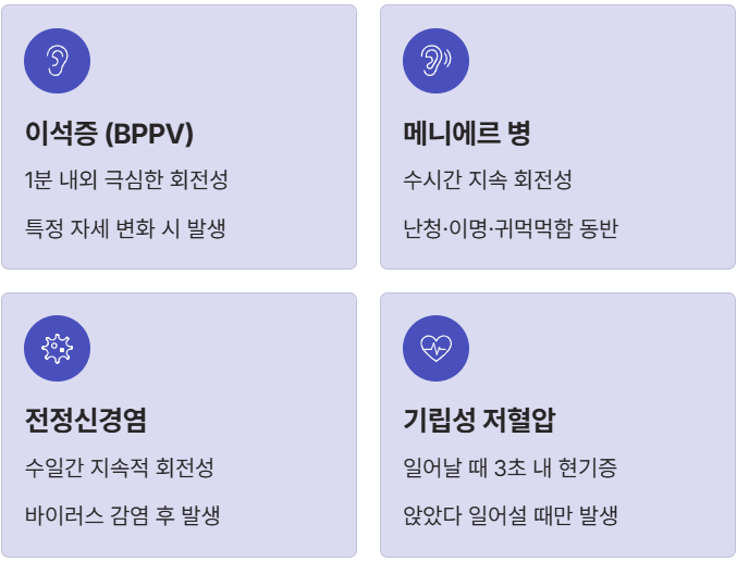 | 전정신경염 | 심한 회전성 | 수일~수일 (지속적) | 감기 등 바이러스 감염 후 발생, 구토/구역 동반 |