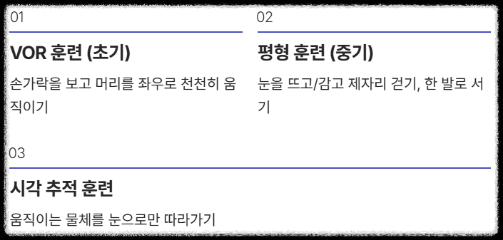 - ✅ VOR 훈련 (시선 안정화): 손가락을 보고 머리를 좌우로 천천히 움직이기 (초기)
