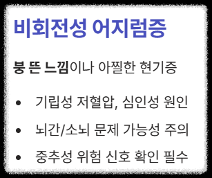 | 기립성 저혈압 | 비회전성 현기증 | 일어날 때 3초 내 발생 (짧음) | 앉았다 일어설 때만 나타남 |