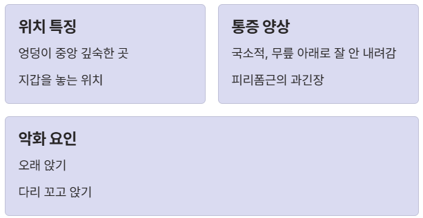 | **이상근 증후군** | **엉덩이** 중앙 깊은 곳 | 오래 앉아있거나 다리 꼬면 통증. 무릎 아래 저림은 드묾. |