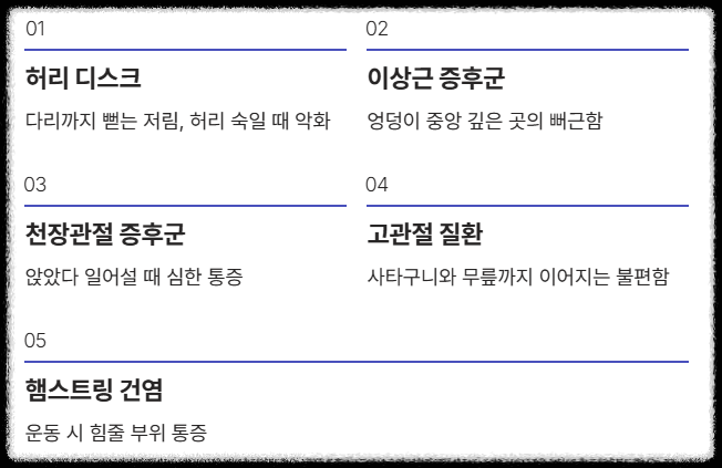 | **천장관절** 증후군 | 꼬리뼈 옆, 한쪽 골반 후방 | 앉았다 일어설 때, 한 발로 디딜 때 통증 심화. |