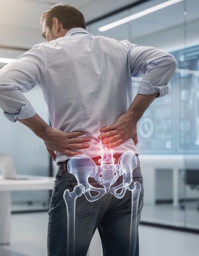 엉덩이 뒤쪽, 허리 아래에 있는 천골(엉치뼈)과 장골(골반뼈)을 잇는 **천장관절**에 염증이 생기거나 기능 이상이 발생하면 통증이 생깁니다. 앉아 있다가 일어설 때, 또는 한쪽 다리에 체중을 실을 때 특히 **엉덩이통증**이 심해집니다.
