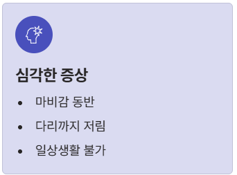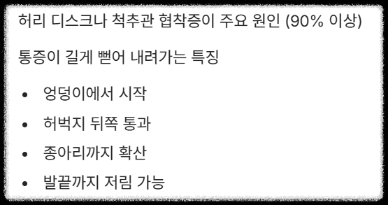 | 좌골신경통 (디스크 기인) | 엉덩이 → 다리(무릎 아래까지) | 저릿함, 마비감 동반. 기침/재채기 시 통증 증가. |