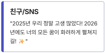 - 친구/SNS: "2025년 우리 정말 고생 많았다! 2026년에도 너의 모든 꿈이 릴스처럼 화려하게 펼쳐지길! 화이팅! ✨"