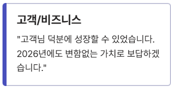 - 고객/비즈니스: "고객님 덕분에 저희가 이만큼 성장할 수 있었습니다. 2026년에도 변함없는 가치로 보답하겠습니다. 새해 복 많이 받으십시오!"