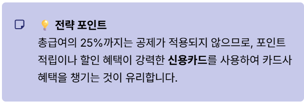 기준액 (총 급여 25% 이하): 신용카드 (부가 혜택 우선)