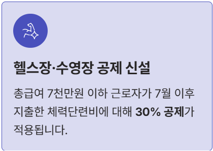 - 헬스장/수영장 공제 신설: 총 급여 7천만원 이하 근로자에 한해, 2025년 7월 1일 이후 체력단련장(헬스장, 수영장 등) 이용료에 대해 30% 공제율이 적용됩니다. (연 300만원 한도 내)