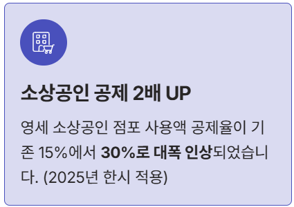 - 소상공인 점포 공제율 인상: 영세 소상공인 점포 신용카드 사용액의 공제율이 기존 15%에서 30%로 2배 인상되었습니다. (2025년 한시 적용)