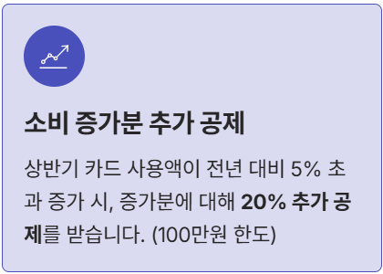 - 상반기 소비 증가분 추가 공제: 2025년 상반기 신용카드 사용액이 2024년 상반기 대비 5%를 초과하여 증가한 경우, 그 증가분에 대해 20%를 추가 공제해 줍니다. (최대 100만원 한도)