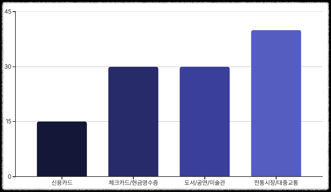 전통시장(40%), 대중교통(40%), 도서/공연/미술관(30%), 헬스장/수영장(30%)처럼 공제율이 높은 항목들은 기준선 초과 여부와 관계없이 공제되므로, 해당 지출이 있다면 우선적으로 공제 한도를 채우는 것이 유리합니다.