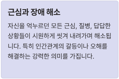 자신을 억누르던 모든 근심, 질병, 답답한 상황들이 시원하게 씻겨 내려가며 해소됩니다. 특히 인간관계의 갈등이나 오해를 해결하는 강력한 의미를 가집니다.
