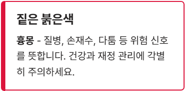 | **짙은 붉은색** | 질병, 손재수, 다툼 등 **위험 신호**를 뜻합니다. | **흉몽** |