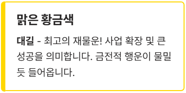 | **맑은 황금색** | 최고의 재물 운. 사업 확장 및 큰 성공을 의미합니다. | **대길** |