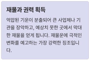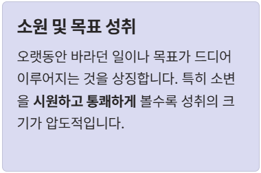 억압된 기운이 분출되어 큰 사업체나 기관을 장악하고, 예상치 못한 곳에서 막대한 재물을 얻게 됩니다. 재물 운에 **극적인 변화**를 예고하는 가장 강력한 징조입니다. - ② 소원 및 목표 성취 (願望 成就)