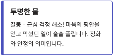 | **투명한 물** | 근심 걱정 해소. 마음의 평안을 얻고 일이 술술 풀립니다. | **길몽** |
