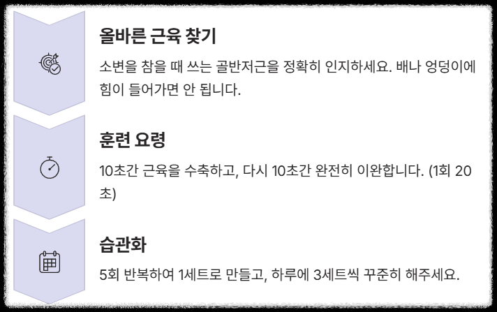 - 올바른 근육 찾기: 소변을 참을 때 쓰는 근육(골반저근)을 정확히 인지하세요. 배나 엉덩이에 힘이 들어가면 안 됩니다.