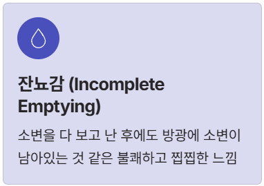 - 잔뇨감(Incomplete Emptying): 소변을 다 보고 난 후에도 방광에 소변이 남아있는 것 같은 불쾌하고 찝찝한 느낌.