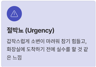 - 절박뇨(Urgency): 갑작스럽게 소변이 마려워 참기 힘들고, 화장실에 도착하기 전에 실수를 할 것 같은 느낌.