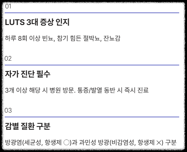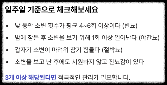 👉 **결과:** 3개 이상 해당된다면, 이미 당신의 방광은 평균 이상의 LUTS를 겪고 있다는 신호입니다. 적극적인 관리가 필요해요!