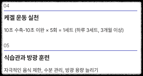 병원 치료도 중요하지만, 오줌소태 증상은 일상 속 자가 관리만으로도 놀라울 만큼 개선될 수 있어요. 핵심은 **방광을 훈련시키고 골반저근을 강화**하는 것입니다.