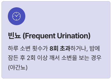 - 빈뇨(Frequent Urination): 하루 소변 횟수가 **8회 초과**하거나, 밤에 잠든 후 2회 이상 깨서 소변을 보는 경우(야간뇨).