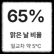 | **특징** | 평균 일교차 5.1°C | 맑음 예상일 65% |