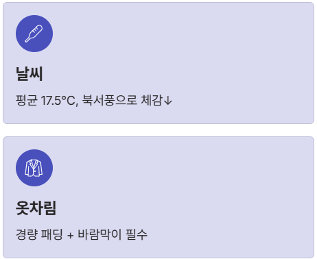 | 경량 패딩 또는 플리스 | 최저 15°C 아침/저녁, 북서풍에 대비하는 보온재. |