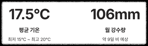| **2월 데이터** | 평균 17.5°C (최저 15.1°C, 최고 20.2°C) | 월 106mm / 9일 |