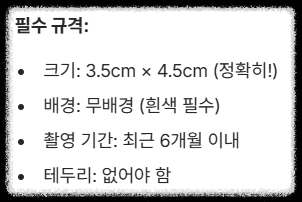 사진 때문에 퇴짜 맞는 분들 진짜 많아요. 3.5cm x 4.5cm 규격은 기본이고, 배경은 무조건 무배경(흰색)이어야 합니다. 테두리가 있거나 얼굴이 너무 작게 나오면 반려될 수 있으니 주의하세요!