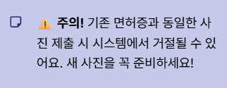 최근 6개월 이내 촬영한 사진이어야 하며, 기존 면허증과 동일한 사진을 제출하면 시스템에서 거절될 수 있습니다. (새로운 사진이 필요해요!)